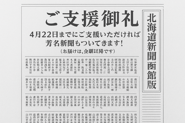 五稜郭祭を支えてくださった方のお名前(ニックネーム)を掲載した、特別な北海道新聞紙面をお届けします。その年、その瞬間に、「この祭りを支えた一人」として名前が残る―― それは、モノではなく記録として残る返礼品です。五稜郭祭が続いてきた歴史の1ページに、あなたの名前を、そっと刻んでください。 ※御礼新聞は、2026年4月22日までにご支援いただいた方のお名前を掲載しお届けいたします。 ※御礼新聞は、箱館五稜郭祭終了後の配送となります。あらかじめご了承ください。 ※上記期日以降にご支援いただいた場合、御礼新聞へのお名前掲載および送付の対象外となります。 ※御礼新聞にお名前を掲載する場合は、必ずニックネーム欄にニックネームをご記載ください。 ※ニックネームの記載がない場合、または判別が困難な場合は、御礼新聞への掲載および送付はいたしかねます。